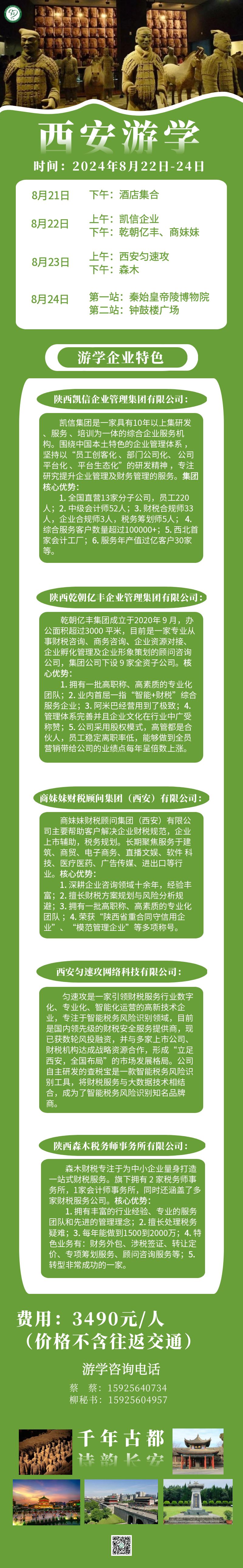 【协会活动】游有所思,学有所成—西安游学开始报名啦!发表时间:2024-08-02 12:03 各位协会家人: 行是知之始,知是行之成。面对瞬息万变的市场环境,我们需要不断加强学习,从而更好地适应和应对日益激烈的竞争。为此,协会安排了为期三天的西安游学活动。 通过参观交流西安优秀同行企业,学习了解其运营模式、管理经验和最新行业动态,帮助我们会员单位拓展视野、激发创新思维,助力企业持续领先,不断把握商机,共赢发展。 本次活动安排如下: 一、活动时间 8月21日(周三)—8月24日(周六) 二、活动对象 协会全体会员单位 三、活动费用 3490元/人 四、活动流程(详见海报) 1、8月21日(周三)下午酒店集合; 2、8月22日(周四)——8月23(周五)前往西安优秀知名企业参观学习交流; 3、8月24日(周六)学习秦始皇帝陵博物院历史文化,参观钟鼓楼广场历史古迹。 五、温馨提示: 1、本次活动由第三方公司提供服务,费用由第三方收取,协会只负责行程内容安排、企业对接。 2、此行游学的目的以学习为主,除自由活动时间外,其他时间需听从组织安排,认真学习,确保大家有所收获是协会组织学习活动的主要目标。 3、报名后需立即确认酒店等预约,且酒店一经预订即支付费用;后期如因个人原因取消行程等,费用将无法退还,请报名前先合理安排好时间,感谢您的理解和支持! 活动报名请联系: 蔡 蔡 15925640734 柳秘书 15925604957 ![]() ![]() ![]() (以上是杭州市代理记账行业协会名誉会长/副会长单位) ![]() ![]() |